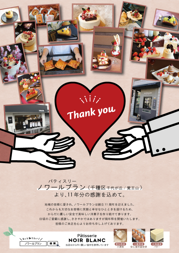 地域の皆様に愛されノワールブランは創立11周年を迎えました。これからも大切なお客様に笑顔と幸せなひとときを届けるため、体に優しい安全で美味しい洋菓子を作り続けてまいります。日頃のご愛顧に感謝し、ささやかではありますが周年祭を開催いたします。皆様のご来店を心よりお待ち申し上げております。