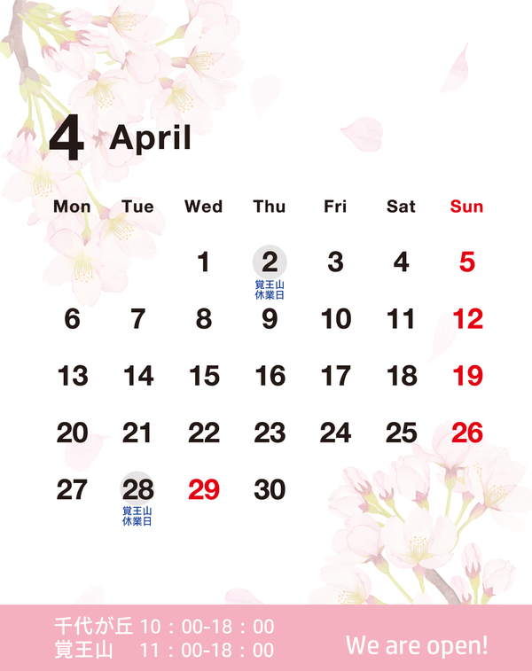【4月のお知らせ】 千代が丘は毎日営業予定です🌸 2(木)覚王山 close 28(火)覚王山 close 営業時間 10:00~18:00千代が丘 営業時間 11:00~18:00覚王山 ※やむを得ず変更がある際にはご容赦ください。
