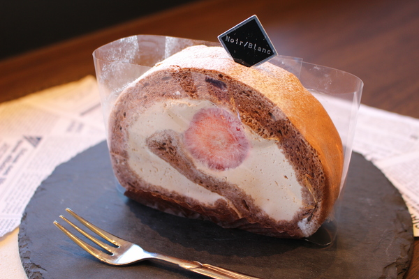 チョコ生クリームと、いちごを包んだふんわりスポンジのロールケーキ。